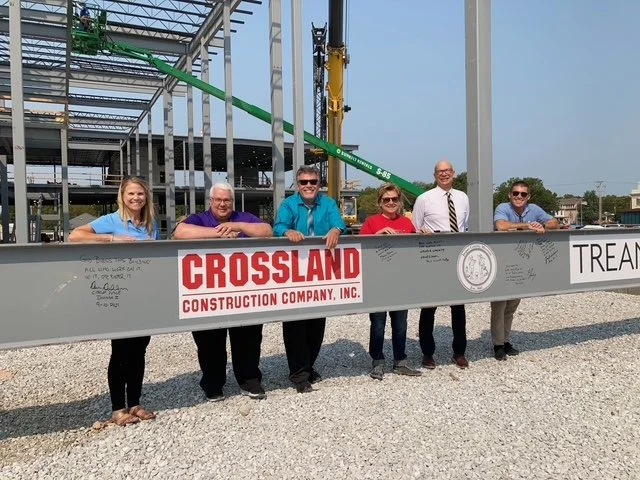 Celebrating putting up the last piece of steel on the new Joplin courts building by signing messages on the steel beam thanking the Jasper County residents for passing the tax to help build this wonderful new building. (From left: Melissa Holcomb, Honorable Judge Dean Dankelson, Honorable Judge Jerry Holcomb (now retired), Honorable Judge Gayle Crane (now retired), Honorable Judge David Mouton, Honorable Judge Joe Hensley. September 10, 2021